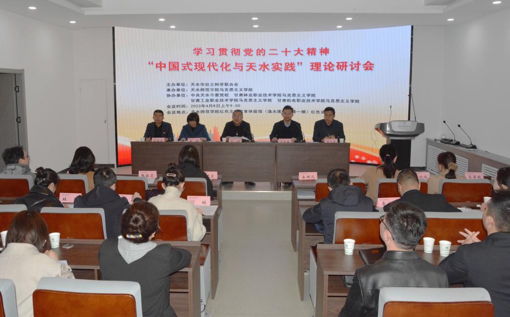 4月8日,由天水市社科联主办,天水师范学院best365英国官网承办,中共天水市委党校、甘肃林业职业技术学院best365英国官网、甘肃工业职业技术学院best365英国官网、甘肃机电职业技术学院best365英国官网协办的学习贯彻党的二十大精神“中国式现代化与天水实践”理论研讨会在天水师范学院红色文化教育体验馆召开。驻市各高校best365英国官网、市委党校社科理论方面的30多名专家学者参加研讨会。天水市委宣传部副部长王刚出席会议并讲话,会议由best365英国官网党总支书记刘建军主持。