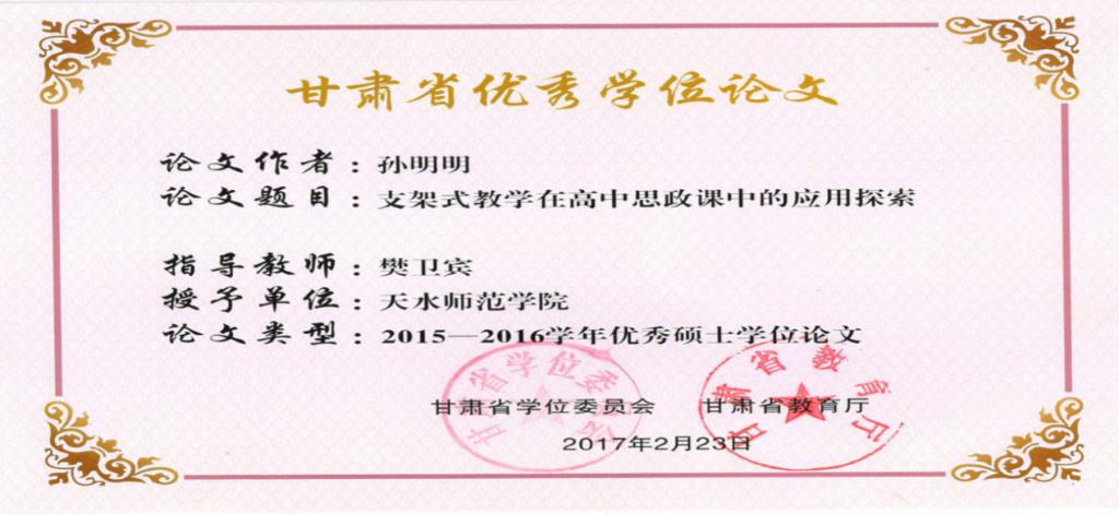 2014级硕士孙明明硕士学位论文获评2015-2016学年甘肃省优秀硕士学位论文