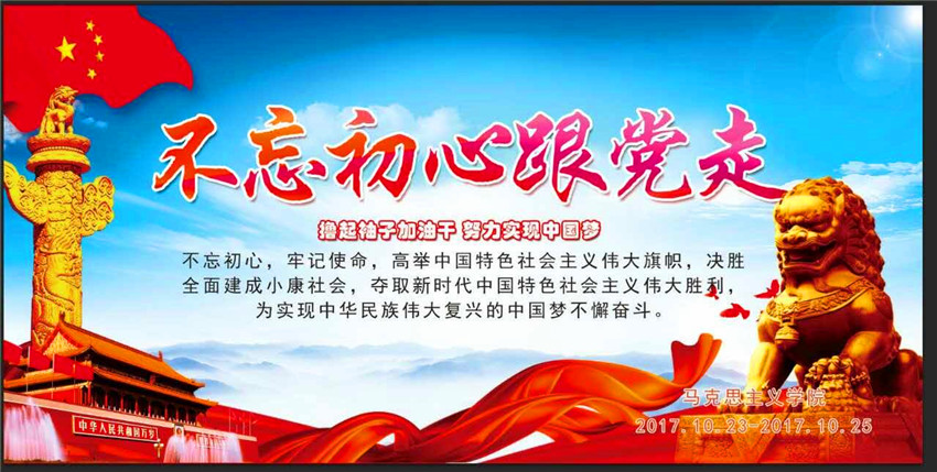 “学习十九大 不忘初心跟党走”不忘初心才能展望未来,不忘初心才能继续前行,只有坚定了理想信念,在未来的日子里我们才能够用青春担当责任,用行动来实践梦想,为实现中华民族的复兴梦而贡献力量。