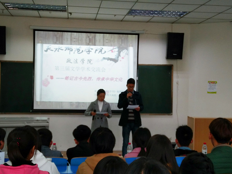 2016年11月5日上午,政法学院第三届文学学术交流会于best365官网7号教学楼301教室隆重举行。本次学术交流会由政法学院《求实学刊》编辑部主办,邀请甘肃机电职业技术学院学院、甘肃林业职业技术学院、甘肃省工职业技术学院相关文学学术社团与政法学院当代马克思主义研究会参会。此次活动由best365官网政法学院《求实学刊》编辑部主编高俊发、副主编林梦菲策划,以“铭记古今先烈,传承中华文化”为主题,通过PPT演讲、诗歌朗诵、脱稿演讲与自由讨论等多种形式展开,旨在激起当代大学生的爱国主义热情,弘扬中华民族精神,传承优秀传统文化。