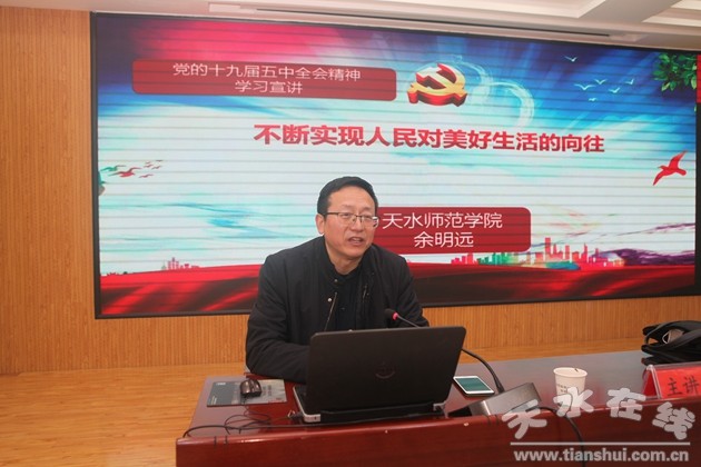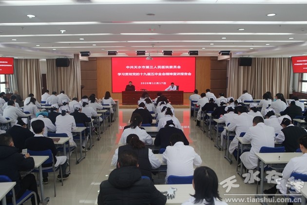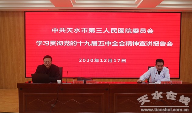 12月17日上午,天水市第三人民医院举行党的十九届五中全会精神宣讲报告会,特邀市委讲师团成员、天水师范学院余明远教授以《不断实现人民对美好生活的向往》为题进行了宣讲。医院党政领导班子成员、中层干部、党员、团员、职工代表共计200余人参加了报告会。会议由党委书记丁志杰主持。