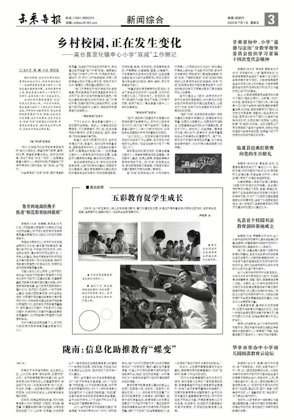 四是创新学生主题活动。教指委将组织委员以“建设幸福美好新甘肃”为视点,在全省初中、小学学生中开展形式多样的主题活动,如专题调研、主题队课、主题故事分享会、演讲比赛等。学生通过调研寻访,从“长辈眼中的过去”和“我们眼中的现在”形成对比,以小见大,切身感受和直观展示甘肃的发展变化,人民生活水平的逐步提高。(佟光宇 郎志文)