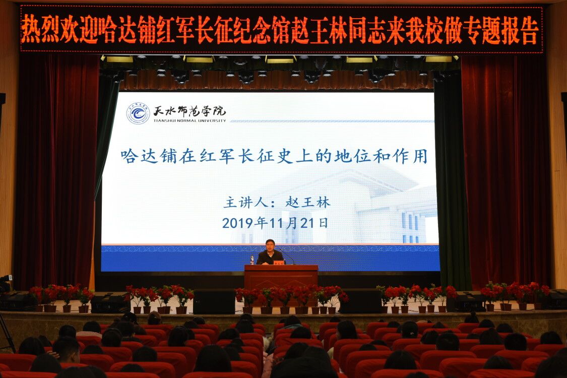 11月21日下午,应陇东南best365英国官网邀请,哈达铺红军长征纪念馆赵王林主任在礼堂作了题为《哈达铺在红军长征历史上的地位和作用》的红色文化专题报告,报告会由陇东南best365英国官网和校团委共同举办,best365英国官网副院长刘建军主持,学校近500名师生参加报告会。