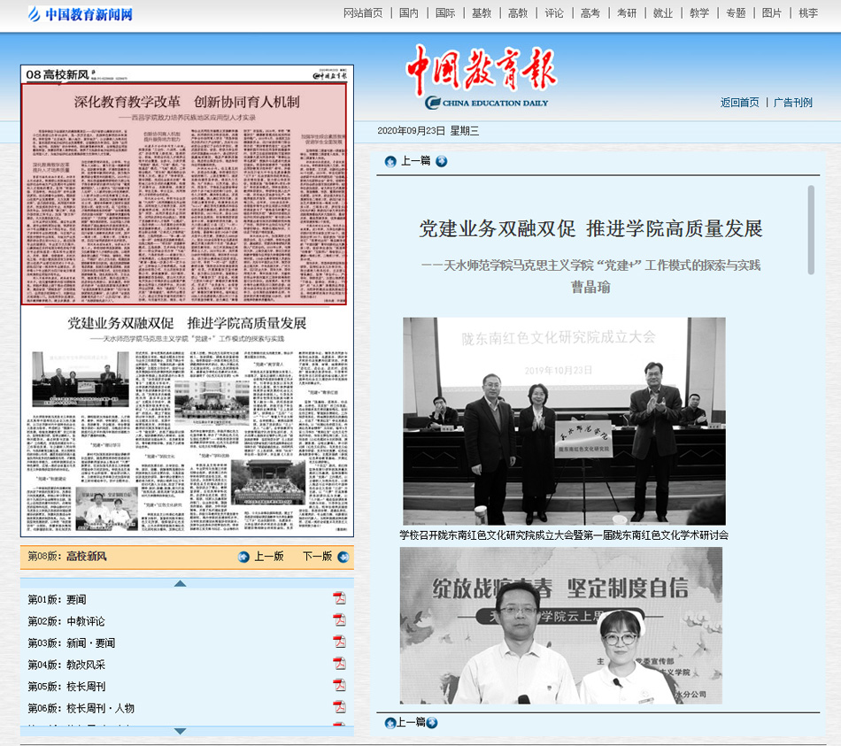 学院党总支以传承红色基因教育为指针,紧紧依托陇东南红色文化资源,做深做实红色党建。以天水师范学院陇东南best365英国官网为载体,发挥红色文化育人功能,将红色文化研究与立德树人、思政课程、课程思政紧密结合。每学期组织一次陇东南红色文化课题调研和学术研讨,深入开展红色文化理论研究;以优化思政课程体系,编著地方特色红色教材为目标,组织编写了《红色文化在甘肃》七种系列学生辅学读本;积极开展红色文化宣传教育,举办了“传承红色文化弘扬红色精神”——学院思想政治理论课教师研学活动、红色文化进校园活动、红色文化专题讲座等。