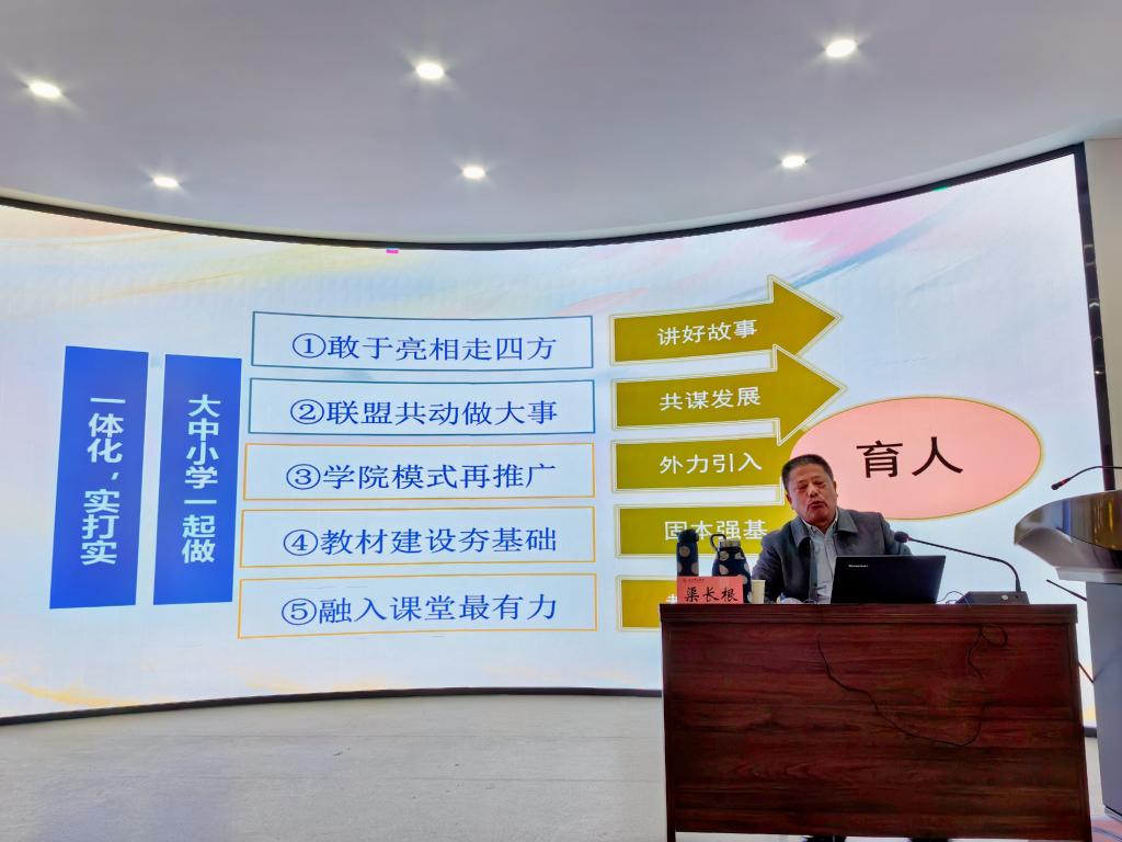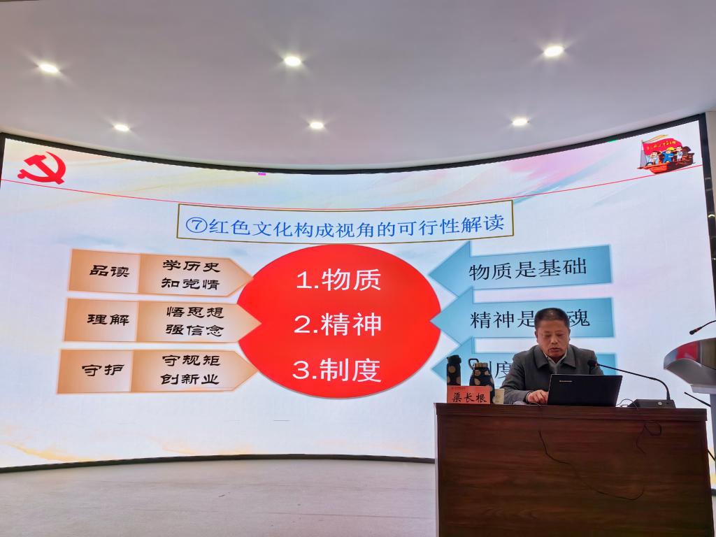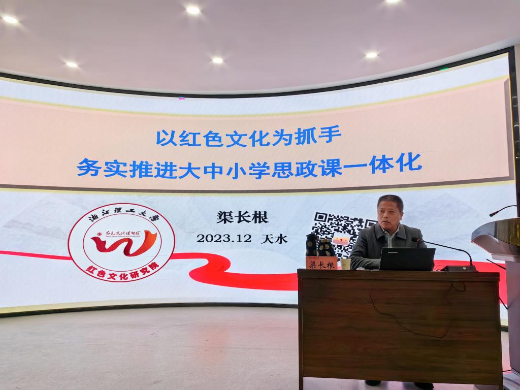为贯彻落实习近平总书记在学校思想政治理论课教师座谈会上的重要讲话精神,深入学习习近平文化思想,进一步发挥学院作为教育部大中小学思政课一体化共同体(甘肃)建设成员单位、甘肃省教育系统红色文化育人共同体牵头单位作用,提升红色文化助推大中小思政课一体化建设实效。12月11日,学院邀请教育部高校思政课教指委《毛泽东思想和中国特色社会主义理论体系概论》分教指委委员、中国红色文化研究会常务理事、浙江省马克思主义理论专业教指委副主任委员、浙江理工大学best365英国官网院长渠长根教授来校作了题为“以红色文化为抓手 务实推进大中小思政课一体化”的专题讲座,此次讲座纳入天水师范学院best365英国官网“红色讲堂”第四讲。讲座由学院党委书记刘建军主持,学院教师、研究生和本科生共100余人聆听讲座。